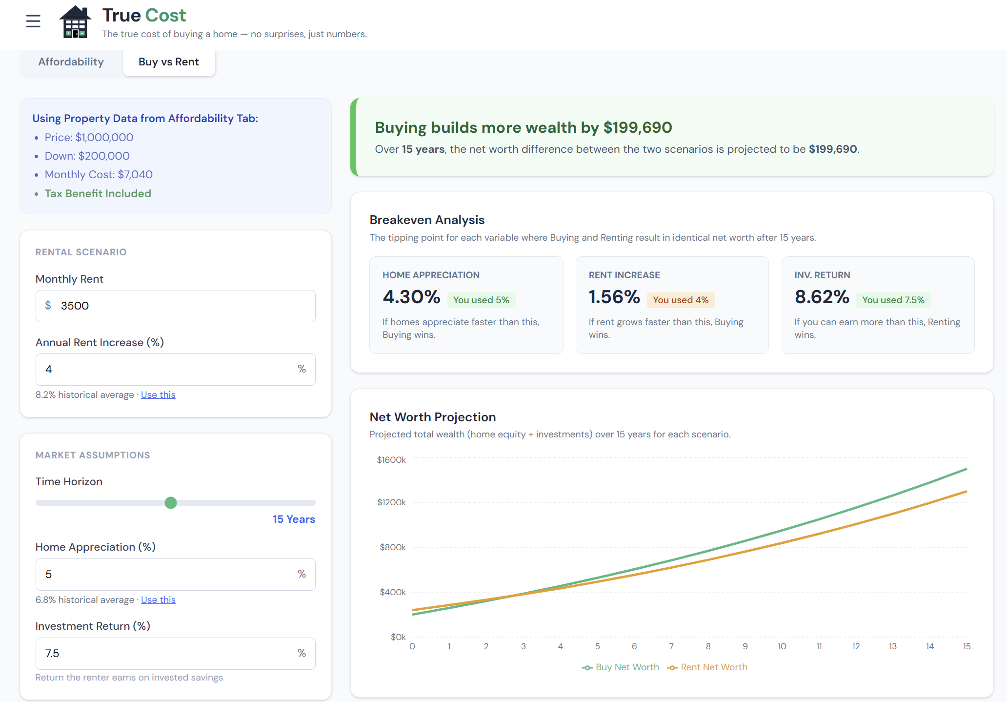 The True Cost Buy vs. Rent Calculator builds a complete 30-year financial model for both paths and tracks your net worth under each scenario year by year. The answer isn't a verdict — it's a break-even year. Before that year, renting wins financially. After it, buying wins. Your planned time horizon does the rest.