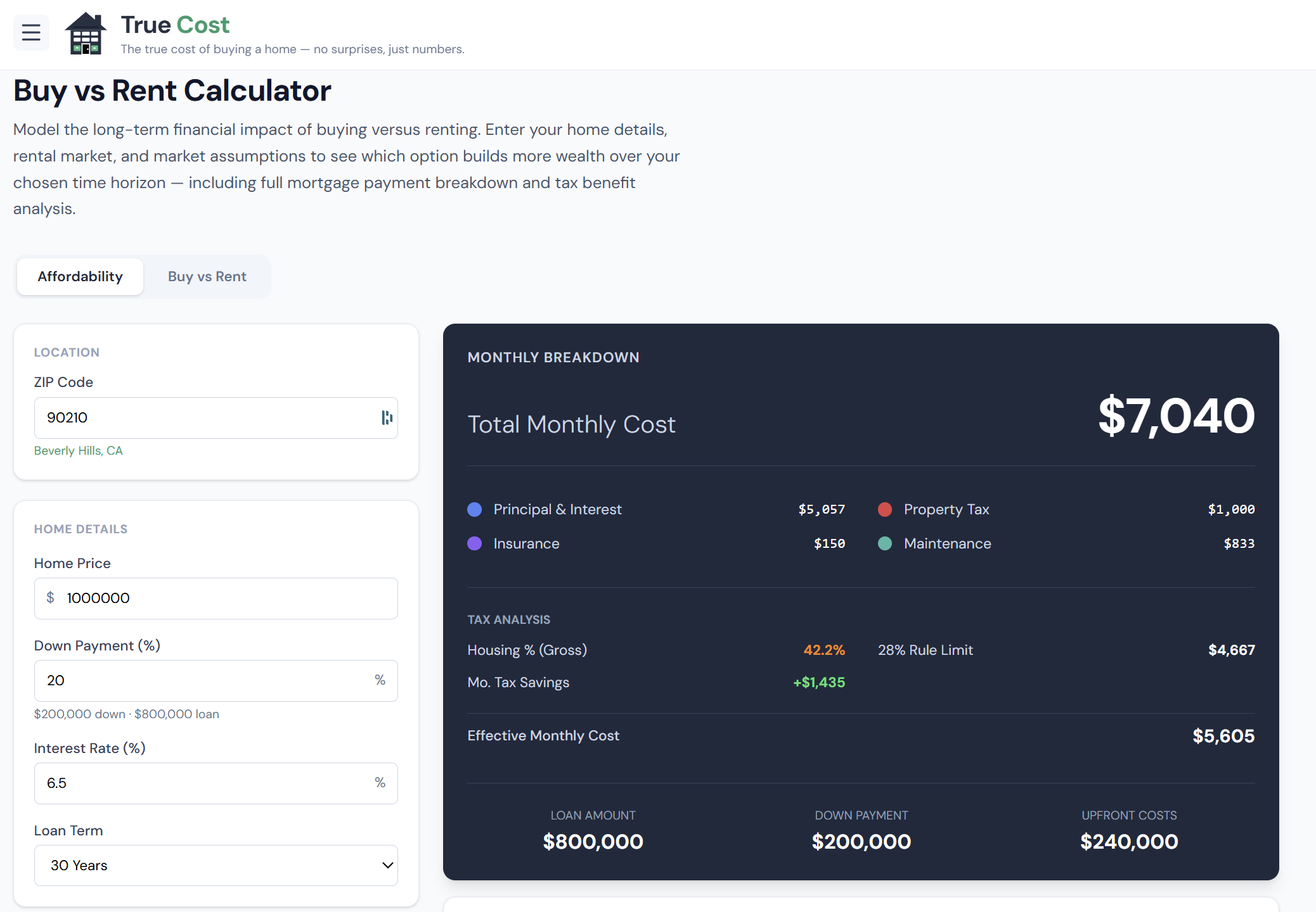 Opportunity cost is fully modeled. The down payment isn't treated as "money you'd have spent anyway." It's invested in the renting scenario, and its compound growth is tracked month by month. This is the single most important modeling decision in any buy-vs-rent tool.