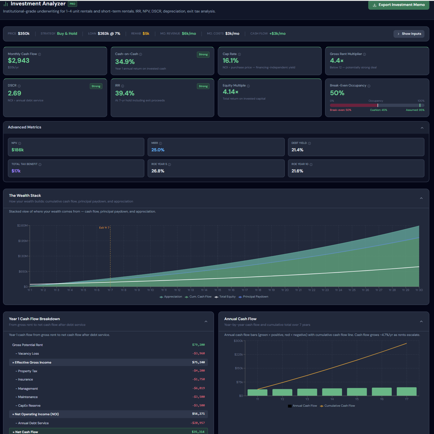 How does depreciation affect the return analysis? Residential rental properties can be depreciated over 27.5 years (straight-line), which significantly reduces taxable rental income. This is a major tax advantage of real estate that the IRR calculator doesn't model (it's a pre-tax cash flow tool). Work with a CPA who specializes in real estate to understand the full tax picture, including depreciation recapture at sale.