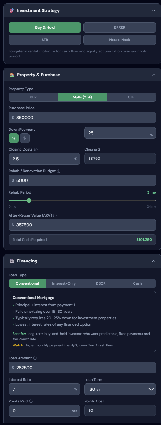 The After-Repair Value field is relevant for value-add investing: you're buying a distressed property, improving it, and refinancing based on the new appraised value (the BRRRR strategy). The calculator uses ARV to model your refinanced equity position.