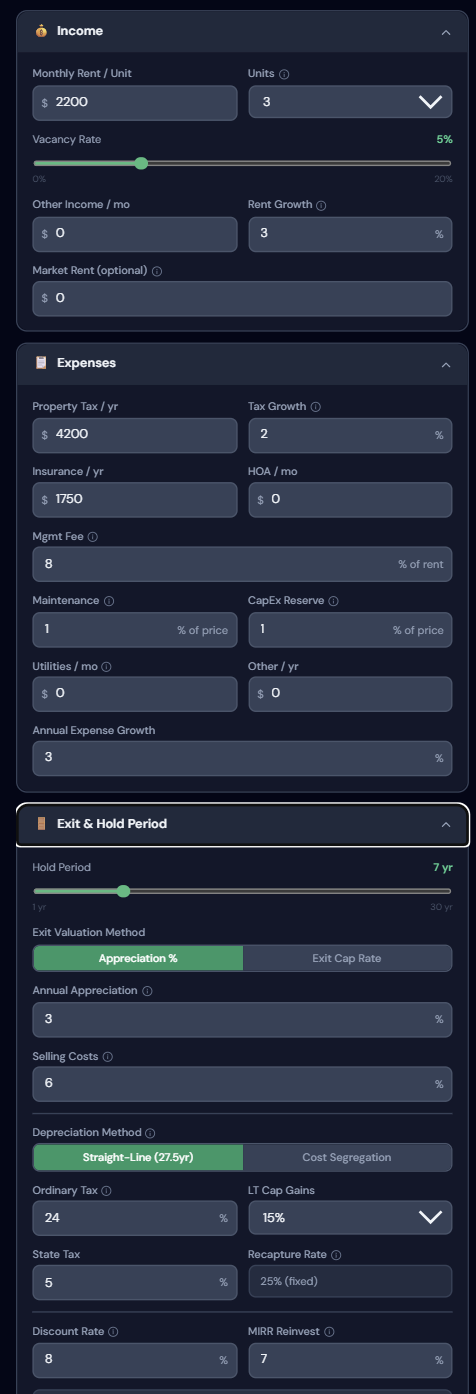 Your rent estimate is the single most impactful input in the model. A $100/month rent error compounds across every year of the hold period and dramatically shifts IRR. Spend time researching actual comparable rents — not Zestimate estimates, but current leased comps from a local property manager or recent Zillow rental listings.