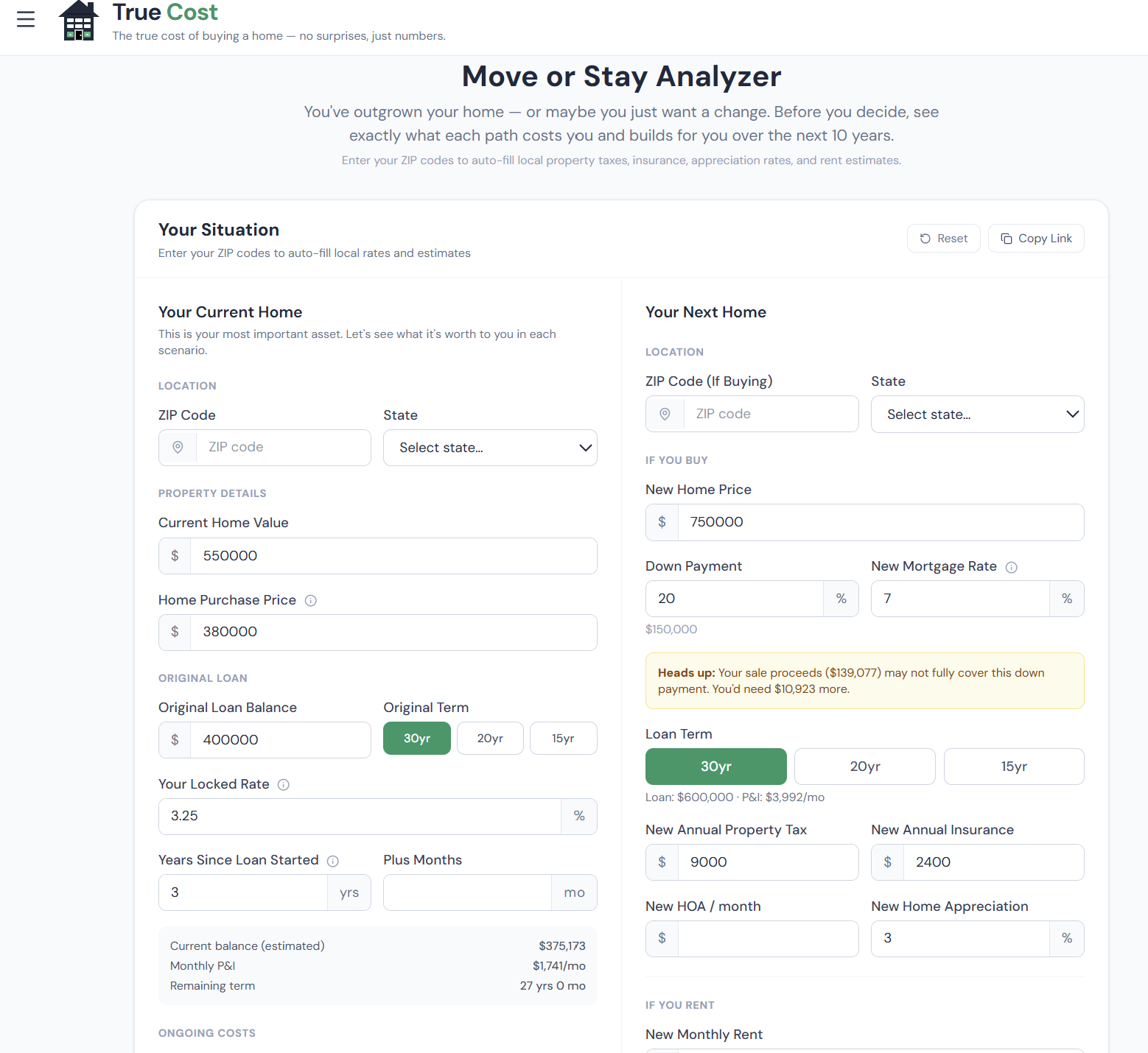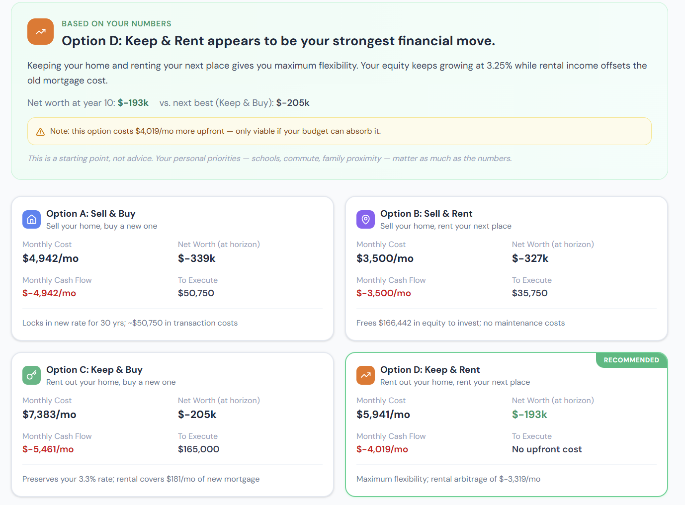The Move or Stay Calculator quantifies this explicitly: the net worth projections for Keep paths include the value of that low-rate leverage on an appreciating asset. In many scenarios, especially for owners with sub-5% rates and meaningful appreciation in their current market, Path 4 (Keep & Rent) is the most financially compelling option — even though it's the least obvious one.