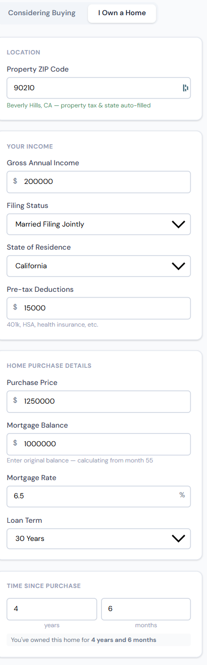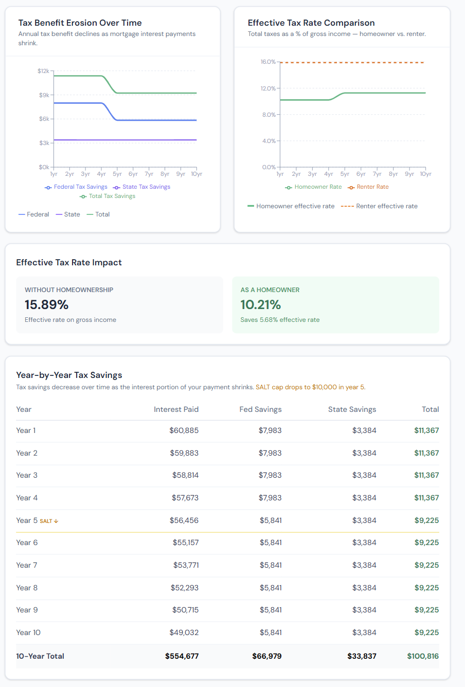 The crossover year — When your itemized deductions drop to the standard deduction level — is one of the most important outputs. After this year, the deduction provides no benefit and the tax calculation is irrelevant to your housing decision.